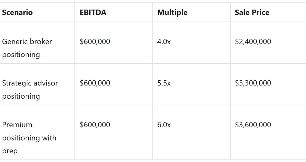 Suppose you own a home health agency generating $5 million in revenue with $600,000 in adjusted EBITDA. A broker who positions your agency as a generic small business might attract buyers offering 4x EBITDA. That gets you a $2.4 million sale price.