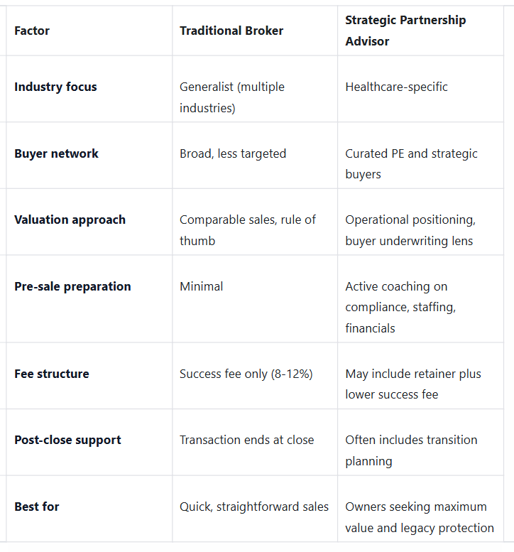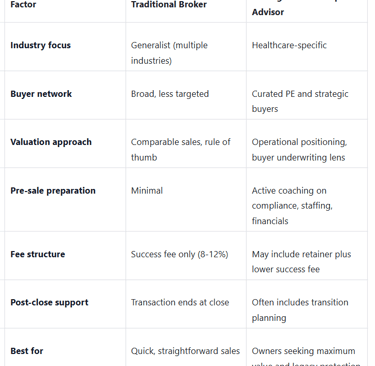 However, most traditional brokers are generalists. They sell dry cleaners, dental practices, and HVAC companies using the same playbook. Healthcare agencies have unique considerations: Medicare certification, state licensure, payer mix, compliance history, and clinical staffing ratios. A generalist broker may not know how to position these factors to sophisticated healthcare buyers.