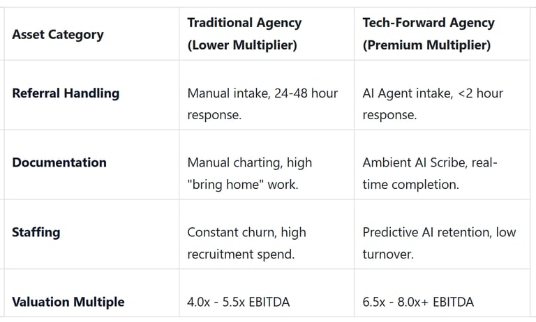 Now compare that to an agency that has integrated AI agents. The workflow is standardized, the clinicians are happy because they don't have "homework," and the data is clean. That agency is a "platform" we can scale. That is the agency we want to acquire at a premium. Check out the 10 valuation drivers buyers actually care about to see where you stand.