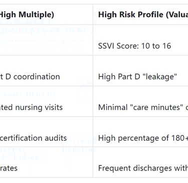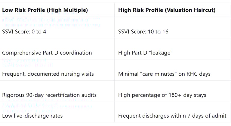 This is not just another internal report. CMS has begun posting provider-level SSVI scores on the Hospice Center webpage. This means your agency’s perceived risk is now a matter of public record. In the current market, where we are actively evaluating acquisitions, a public risk score is often the first thing a buyer looks at. If your score is high, it signals potential "program integrity" issues, which translates to risk. And in the world of M&A, higher risk always leads to lower valuations.