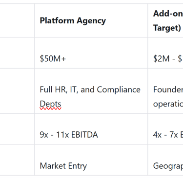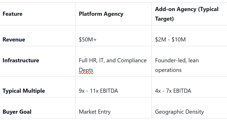 If your agency has $1M in EBITDA and you are operating as a clean, efficient add-on, a 5x multiple results in a $5M valuation. If you have "platform-like" qualities, such as a full middle-management tier, that multiple could climb higher.