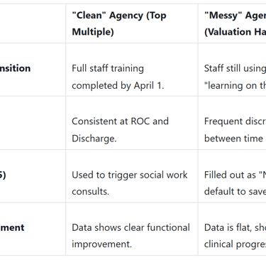 If you are planning to sell your agency in late 2026 or 2027, the data you are collecting right now is what we will be auditing during due diligence. We don't just look at the last month of data; we look at trends. If your agency shows a "dip" in quality scores or an increase in documentation errors starting in April 2026, it tells us that your leadership team struggles with change management.