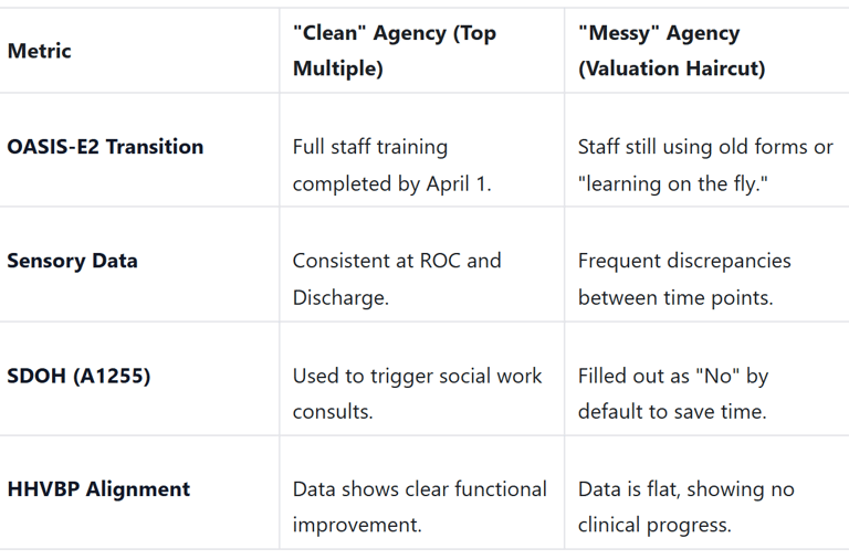 When a buyer like Senate Healthcare looks at your agency, we aren't just looking at your current revenue. We are looking at how "buyable" your data is. If your OASIS-E2 entries are inconsistent, it signals to us that your team might be struggling with the transition, which represents a post-acquisition risk. To avoid this, you need to focus on three specific data categories that are currently driving buyer underwriting.