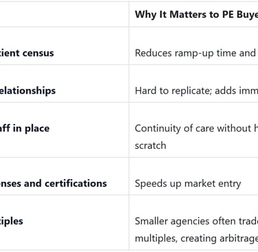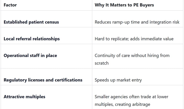 Applies to: Both hospice and home health agencies. While deal structures may vary slightly, the PE appetite for mid-market healthcare services is sector-wide.