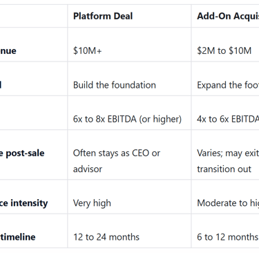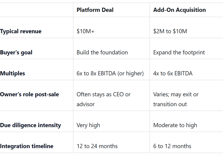 If you're in the $2M to $10M range, you're most likely looking at an add-on scenario. That's not a bad thing. Add-on deals can close faster, involve less operational disruption, and still deliver strong returns if you're prepared.
