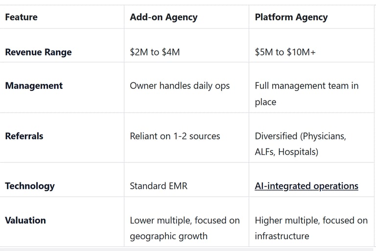 Scenario B (Hospital Divests): If the hospital exits and you become the dominant local provider with a strong referral network, your agency could be viewed as a "platform" asset. This can push the multiple to 6x or even 7x for the right buyer. Valuation: $4.5M to $5.25M.
